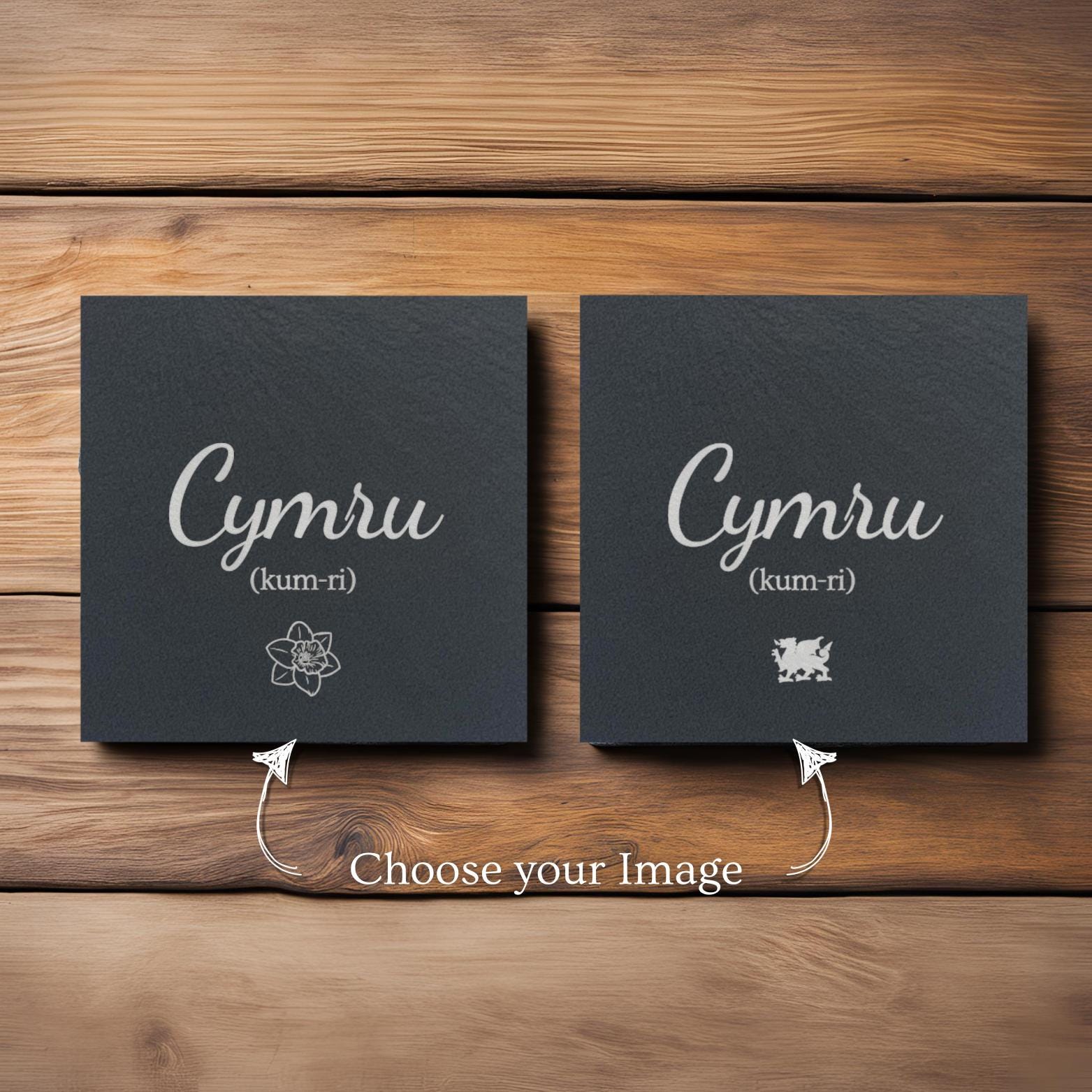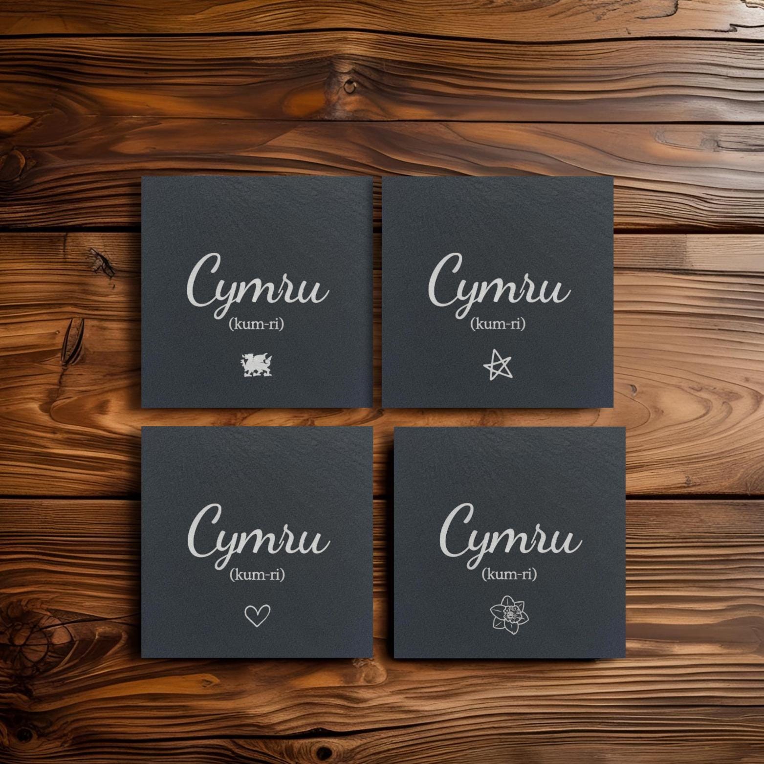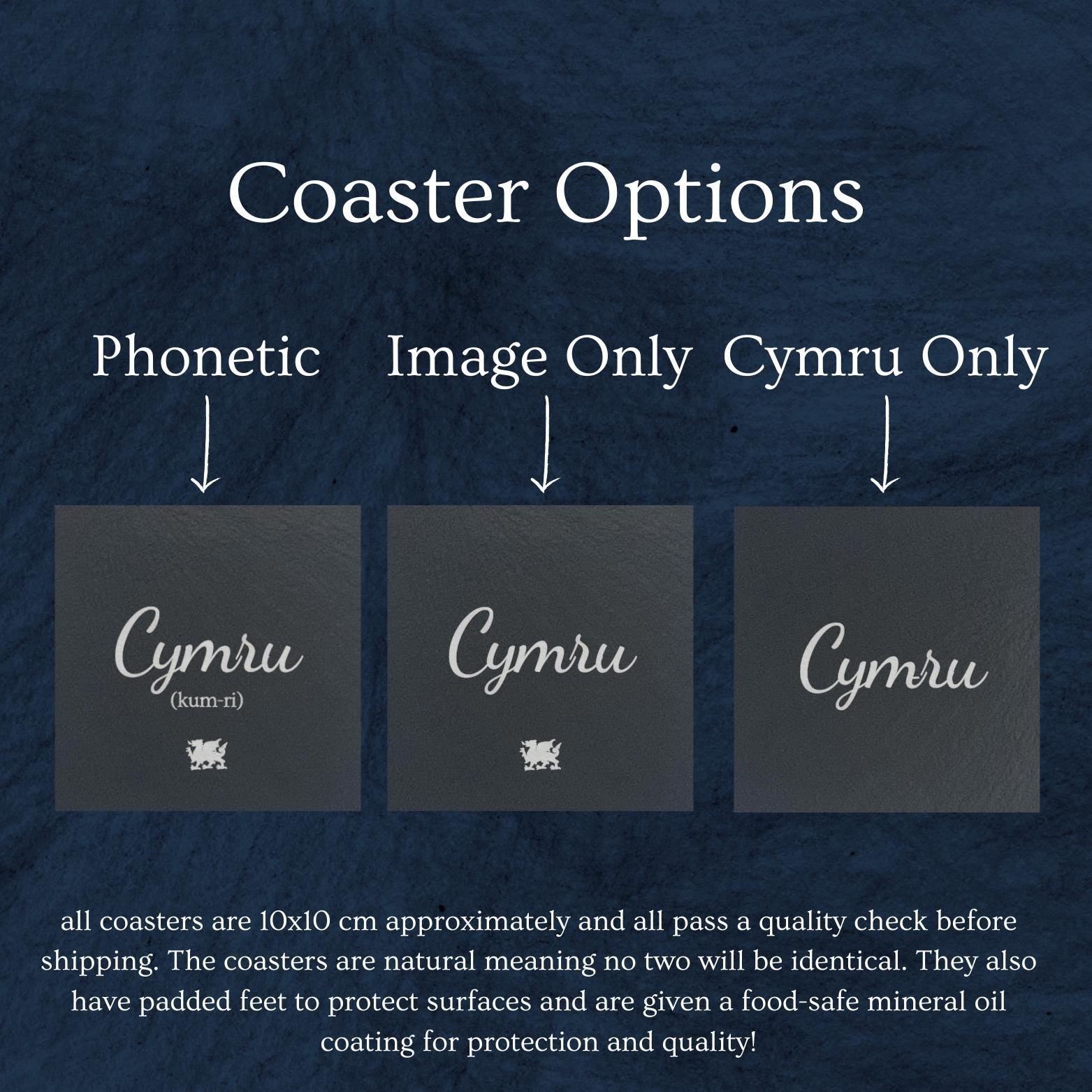 Cymru style slate coasters! Customise your Cymru slate coaster with one of our four image options! Our coasters are 10cm x 10cm and quality checked before being laser engraved with your chosen detail, before receiving a coating of food-safe mineral oil to both protect it from stains and provide a more intricate, vibrant finish! Our slate is naturally sourced meaning that no two coasters will be identical, but will have undergone and passed our quality checks before shipping. Please feel free to contact us with any special requests or changes, we are happy to help! *****PLEASE USE THE CODE -- 'MULTI' -- AT CHECKOUT FOR 25% OFF IF YOU PURCHASE 3 OR MORE COASTERS! ***** Coaster Options Include: Dragon, Daffodil, Heart Star. Please note that only one coaster will be included for £4.99. Thank you! If you don't see what you're looking for, send us a message for a free coaster design to be made for you!