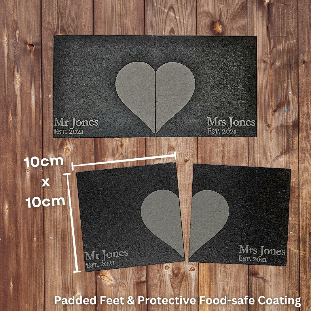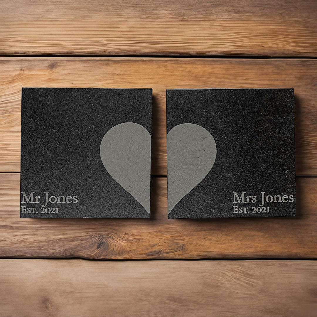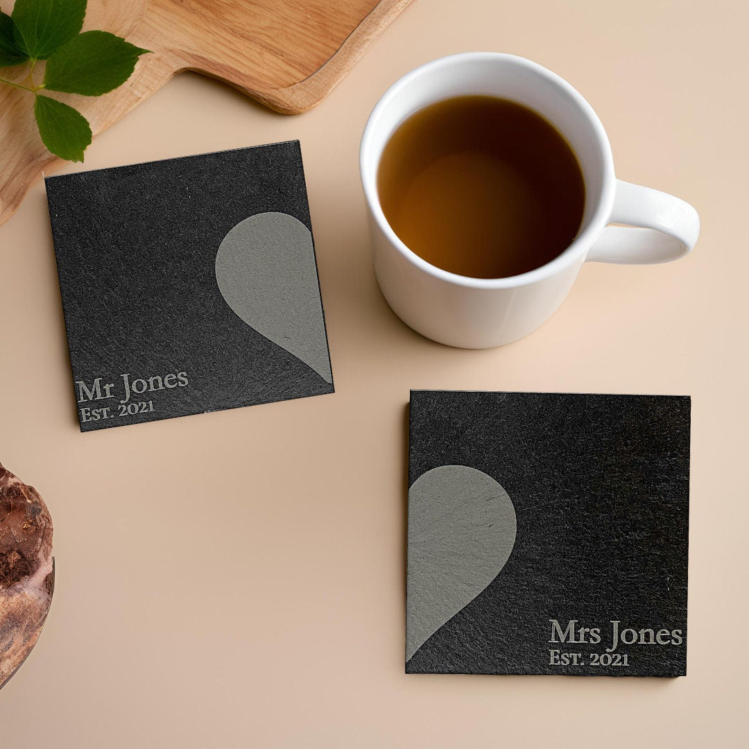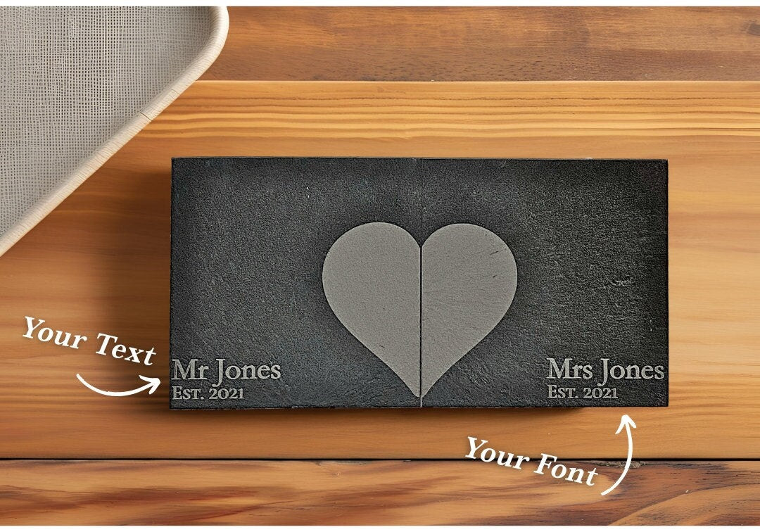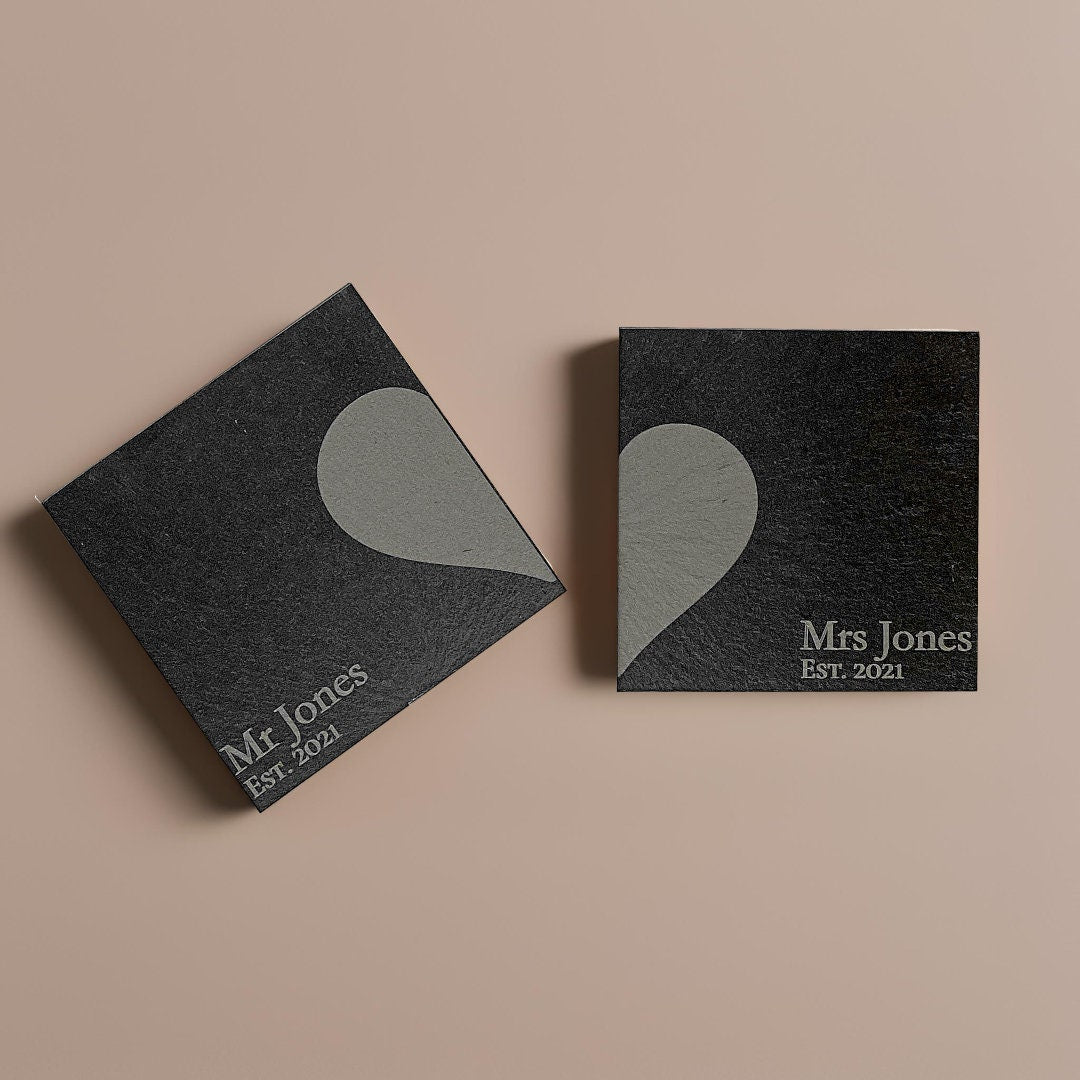 Personalized Slate Coaster Matching Set (2 coasters included), Perfect for Couples, Anniversaries, Weddings, Girlfriends and Gifts! Personalize your coasters with your desired text (Does not have to be Mr & Mrs). Our coasters and quality checked before being laser engraved with your chosen detail, before receiving a coating of acrylic matte spray to both protect it from stains and provide a more intricate, vibrant finish! Please note that any spelling will be assumed correct & a maximum of 12 characters are permitted per line. Our slate is naturally sourced meaning that no two coasters will be identical but will have undergone and passed our quality checks before shipping. Please feel free to contact us with any special requests or changes, we are happy to help!