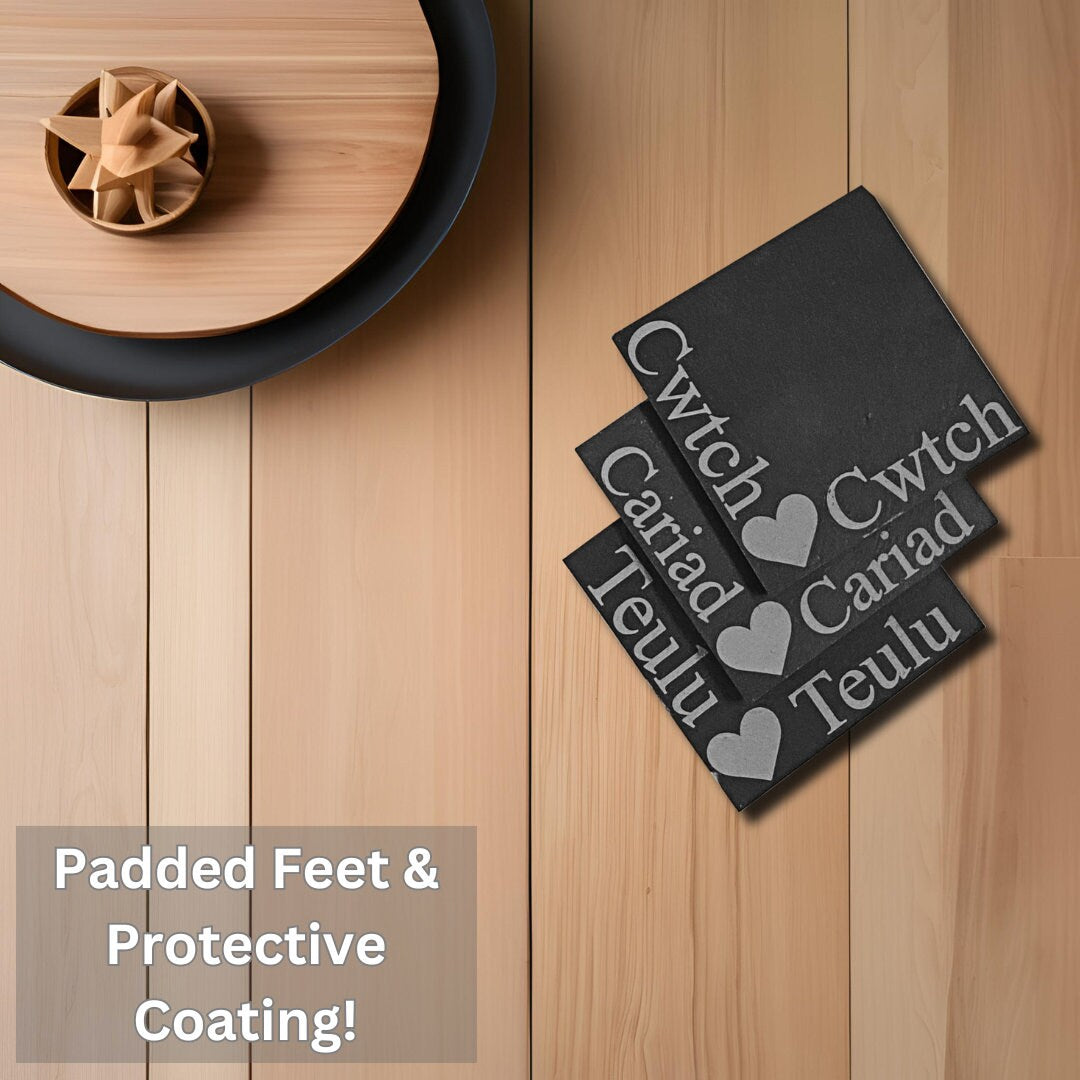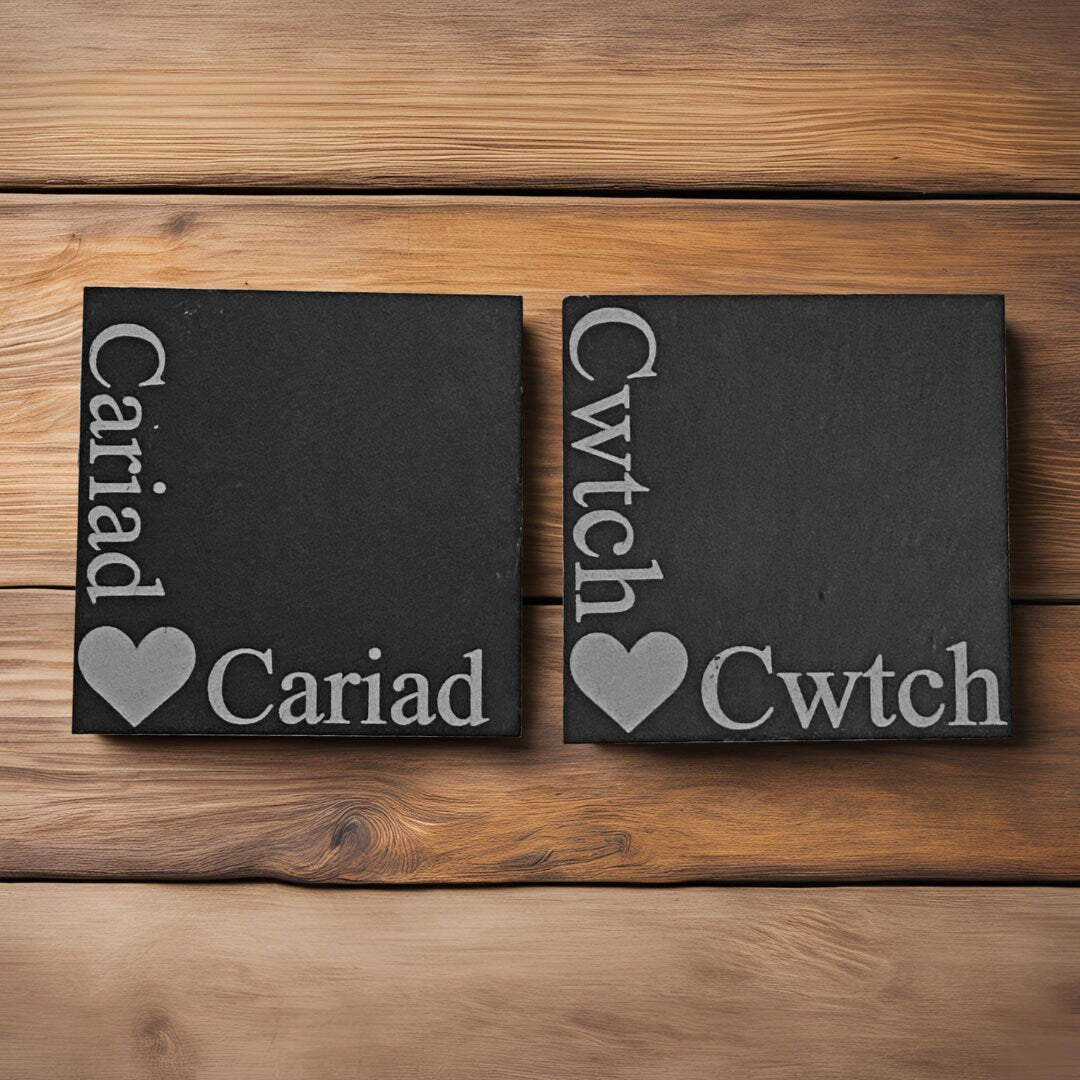 Welsh Language & Personalized Slate Coasters, Perfect for Couples, Anniversaries, Weddings, Caravans and Gifts! Our coasters and quality checked before being laser engraved with your chosen detail, before receiving a coating of mineral oil to both protect it from stains and provide a more intricate, vibrant finish! Please ensure to specify which coasters you would like to purchase. Our slate is naturally sourced meaning that no two coasters will be identical but will have undergone and passed our quality checks before shipping. Please feel free to contact us with any special requests or changes, we are happy to help!